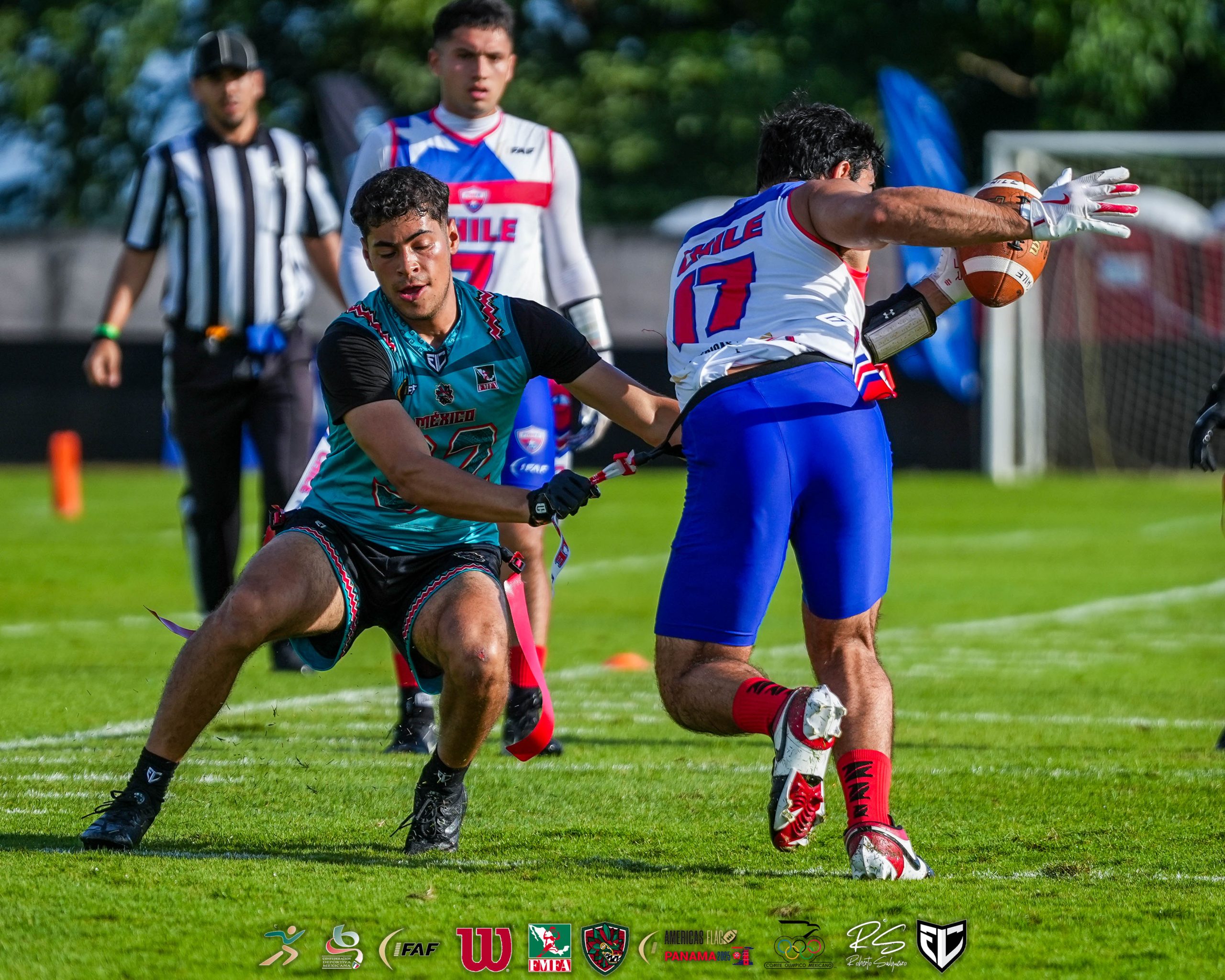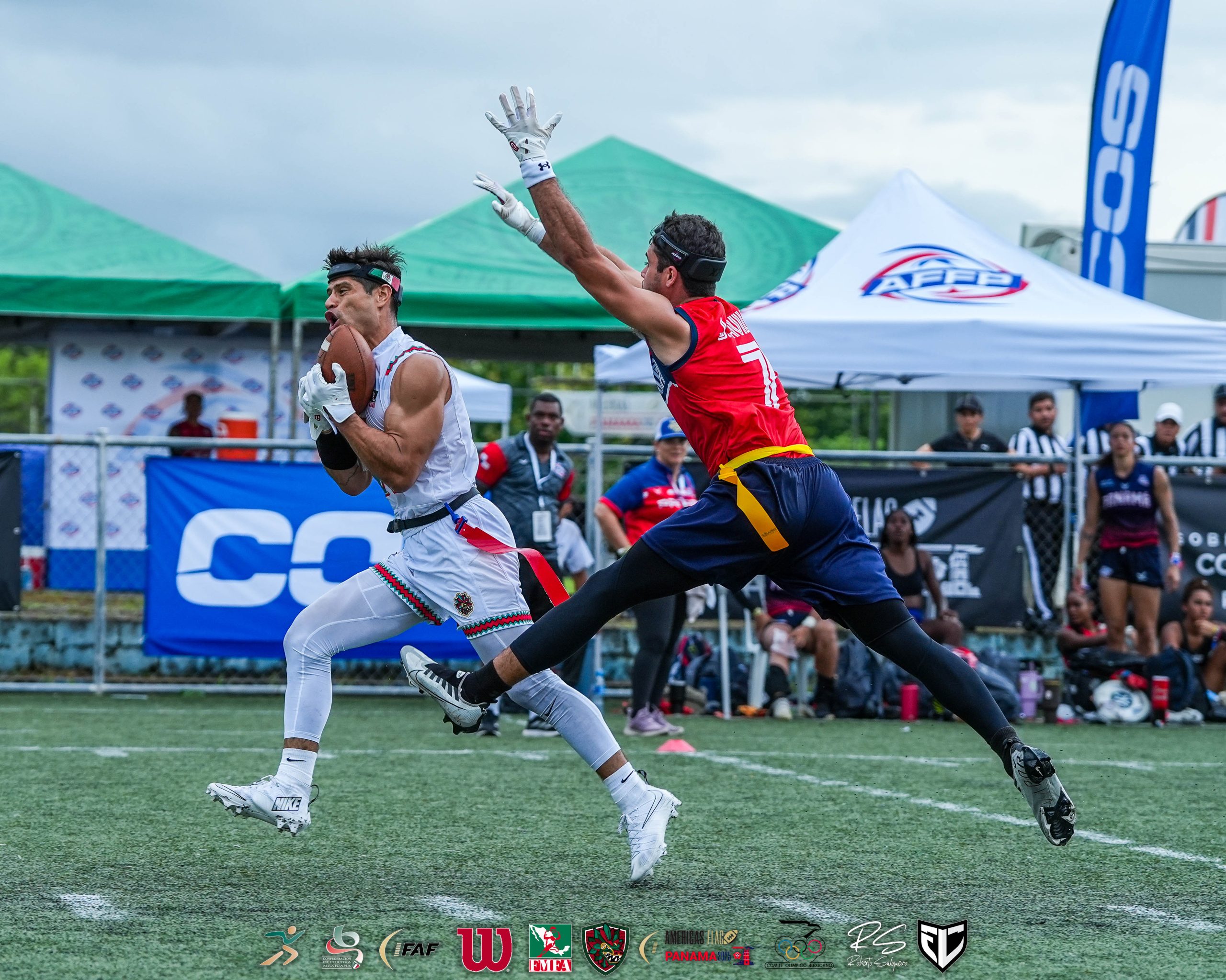México logra tercera victoria en el Continental de flag football de Panamá* Dominó a Jamaica y se impuso 64-18. La selección varonil de México no tuvo problemas para conseguir su tercera victoria consecutiva en el Torneo Continental de flag football que se disputa en Panamá, luego de imponerse holgadamente a Jamaica por 64-18. Los mexicanos iniciaron la jornada imponiéndose 54-0 a El Salvador; después doblegaron 54-27 a Argentina; y cerraron con el triunfo sobre los jamaicanos. Mañana deberán enfrentar a Chile, a las 8 horas; y a Panamá, a las 16:45 horas, para completar su participación en la primera etapa de la competencia. Los quarterbacks Diego Rodolfo Pérez Arvizu (1) y Víctor Manuel Balderramos Sánchez, se combinaron para cinco pases de touchdown en la primera mitad, para tomar delantera de 45-6. Pérez Arvizu concluyó el juego con seis y Balderramos con uno. Los envíos fueron: cuatro a Luis Alberto Villegas González (14), quien fue el mejor por México; dos con Cristopher Bryan Cardona Padrón (12); y uno con Luis Alberto Villegas González (14). En la defensiva Ricardo Corona Placeres (2), tuvo dos intercepciones, una de ellas con regreso para anotación. Ya en la segunda mitad México simplemente administró el juego para concretar el triunfo, pero aun así anotaron 19 puntos más.