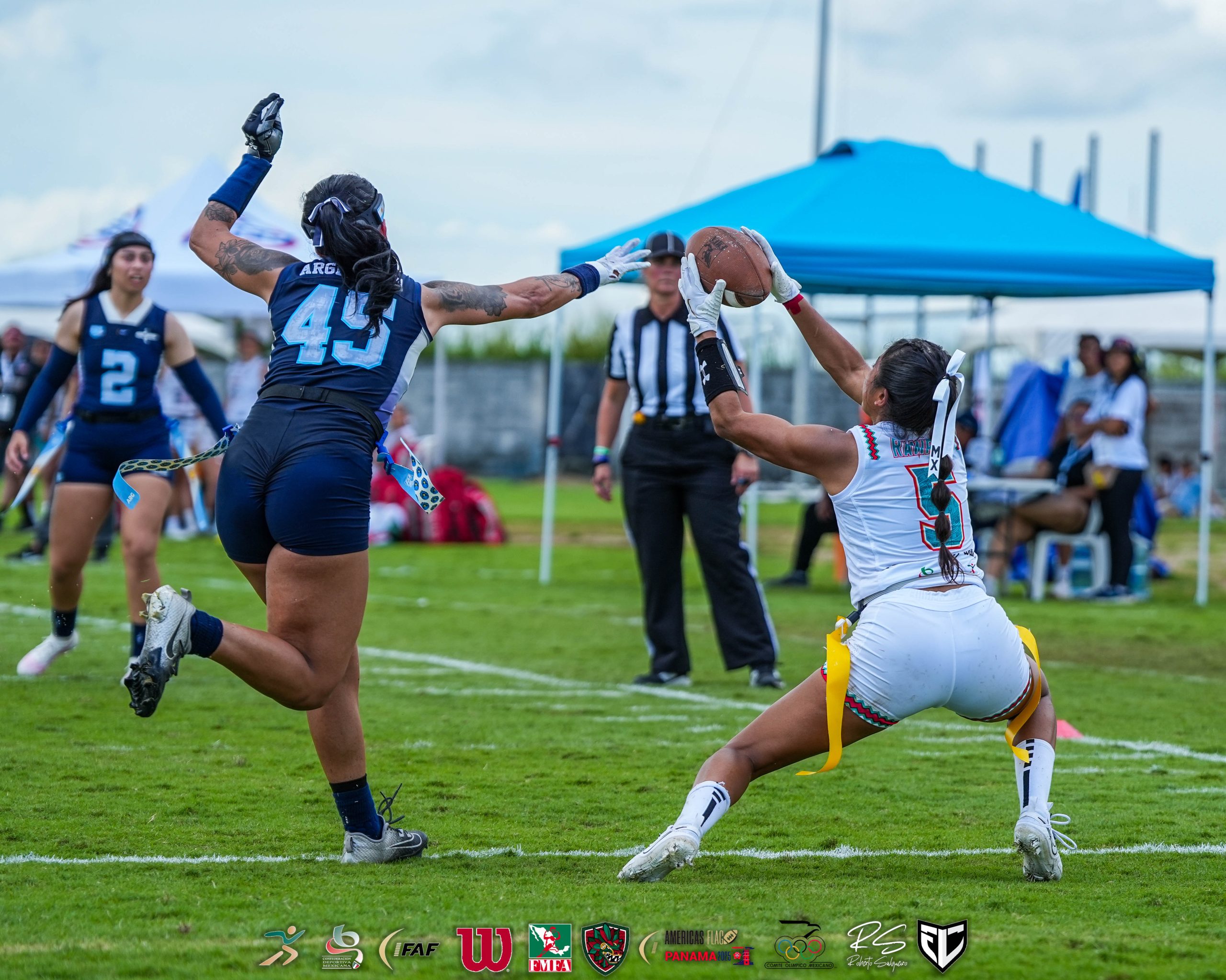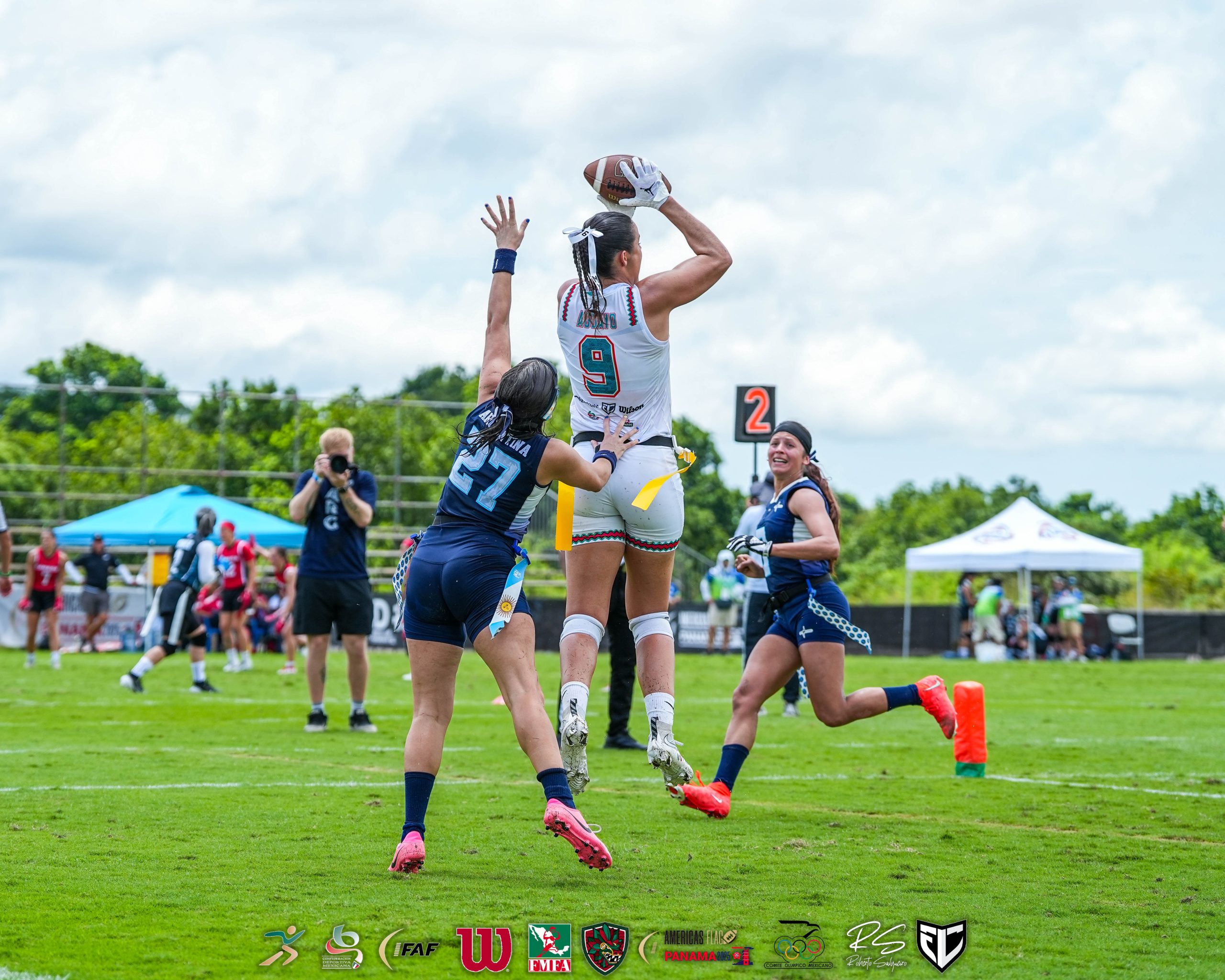 El staff de coacheo de México ha realizado un gran trabajo moviendo a todo el personal disponible; y pese a ello el equipo sigue ganando. Hoy, la jugadora Alondra Ramírez (5), quien reemplaza a la centro veterana, Silvia Contreras, quien no participó por estar lesionada, realizó cuatro recepciones de touchdown y llegó a ocho en la competencia, empatando a Ana Consuelo Aguayo (9).En el duelo ante Argentina los coaches decidieron dar tiempo al frente del ataque a sus dos quarterbacks: Tania Rincón (31), quien trabajó toda la primera mitad, completó 4 pases de touchdown, tres de ellos con Alondra Ramírez (5); y otro con Andrea Martínez (13); y Diana Flores, quien tomó el control en la segunda mitad y completó tres pases más de anotación, con Ana Consuelo Aguayo (9), Alondra Ramírez (5) y Mónica Rangel (4). De esta manera, las dos quarterbacks han completado 16 envíos a las diagonales en el torneo, 8 cada una. Pero sin duda lo mejor que ha presentado México es su defensa, que solo ha permitido dos anotaciones en igual número de juegos. Hoy, Victoria Chávez (2), consiguió una intercepción que dio paso a la primera anotación de México en el juego. Ha sido tal el dominio defensivo, que la selección argentina festejó su solitaria anotación, que llegó casi al final de la segunda mitad, en pase de Pamela Andrea Méndez (4) a Delfina Salange Lobo (15), como s hubieran ganado la final. México regresará a la actividad a las 13:15 horas, enfrentando a la selección de Canadá, con la que jugaron la semifinal en los World Games.